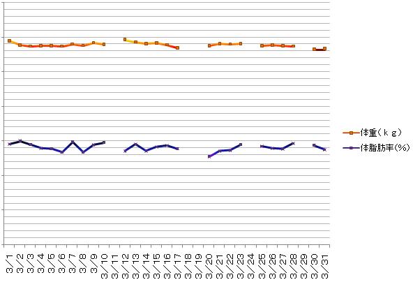 ガンダムの感想×2はもうしばしお待ちを…待ってる人いるのかw 1回は見たんですが感想書くためにもう1回見ます… 今期終わりのアニメについて。 絶チルもソウルイーターも面白かったなぁ… 絶チルはコミックス欲しいかも>< ソウルイーターは…原作ストーリーからオリジナルの転換が見事。 いい感じに鬱な時は鬱でよかったです。シュタイン博士がさまよう回とかソウルの黒血とか。深夜枠オンリーでよかったんじゃないかと一瞬ww 死神様ロボットには爆笑← 終わりじゃないけど最終回をやった銀魂は相変わらずw アレは何?スーツ姿の3人組に萌えればいいところ??(ぁ) 4月期からは鋼の錬金術師、そしてハヤテのごとく!を見よう…感想書くかは不明。多分書かないような。 鋼にロックオン兄さんがいるよ~\(^o^)/(声優的な意味で) ではでは月末恒例行事。 今月の体重変動! …ていうか毎月グラフの幅違うから並べてもよくわからんっていうか。 うん。 しかも今回測定しなさすぎですしね! 飲み会とか東京とか…なんですが^^; 途切れ過ぎにもほどがあるorz まぁ、一応、ちょいちょい減ってます。 ここ2日が最少記録気味… 4月頭も飲み会だの誕生日だのがあるので増えそうですが…orz それ以降は学校行くんでやつれていく予定です。主に有機実習のせいで← そんなこんなでまぁ…ぎりぎりまで遊んできますw それじゃ、またノシ